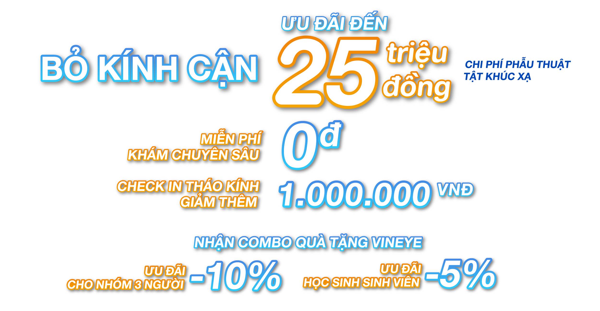 🎁 Phẫu thuật tật khúc xạ (cận, loạn, viễn) & lão thị với mức chi phí tốt nhất hiện nay bằng các phương pháp hiện đại hàng đầu: Femto Pro, SMILE PRO, ReLEx SMILE, Lasik, PHAKIC … cùng với các phương pháp phẫu thuật Đục thủy tinh thể Phaco, kính kiểm soát cận thị trẻ em Ortho – K hiện đại, tiên tiến nhất Thế giới. 🎁 Giảm 1.000.000 VNĐ khi bệnh nhân tham gia check in “Tạm biệt kính cận” hoặc share bài trên trang cá nhân.🎁 Miễn phí gói khám chuyên sâu trước phẫu thuật 8 bước chuẩn Quốc tế trị giá 1.000.000 VNĐ (Áp dụng có điều kiện). ️🎁 Giảm 1.000.000 đ/người khi Xóa cận nhóm. Giảm thêm 1.000.000 VNĐ Xóa cận cho HSSV.🎁 Đặc biệt: Mỗi khách hàng tới điều trị tại Vineye là chung tay góp 100k vào “Quỹ trẻ em Việt Nam”🎁 Mỗi tháng Vineye tài trợ 100% chi phí điều trị Đục thủy tinh thể cho 10 hoàn cảnh khó khăn, người nghèo, người có công !